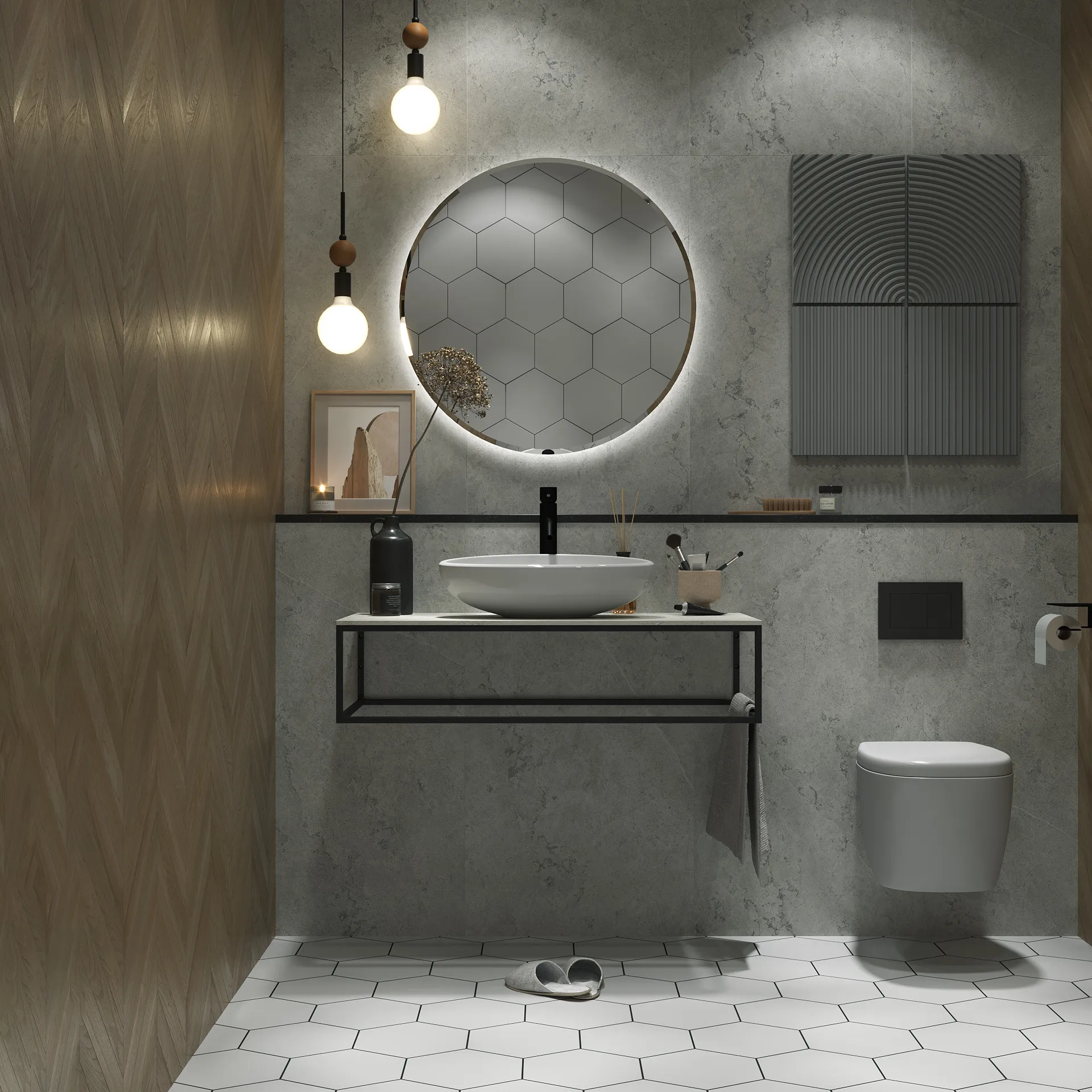 Столешница из керамогранита - это стильное, функциональное и долговечное решение, которое подойдет для ванных комнат, исполненных в самых разнообразных отделочных материалах. Такая универсальность, тем не менее, предполагает высокую декоративную и эстетическую ценность столешницы - она делает обстановку в ванной комнате по-настоящему стильной и соответствующей актуальным тенденциям в дизайне. Металлическое подстолье создает эффектный цветовой контраст, а также может использоваться в качестве практичных рейлингов для удобного размещения полотенец и банных халатов.